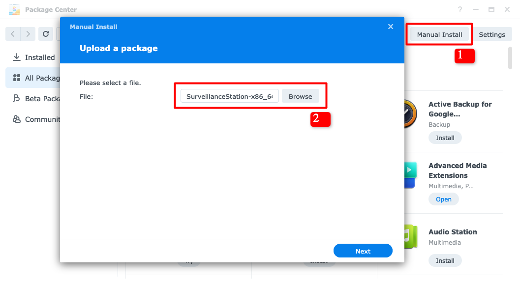 Mở Package Center, bấm vào Manual Install và chọn file spk vừa tải về. Bấm Next