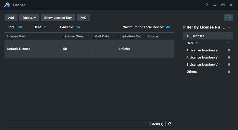 Sau khi cài đặt xong, bạn cần khởi động lại DSM. Sau đó truy cập vào SS, mở app License lên sẽ thấy số lượng license đã tăng lên thành 58.