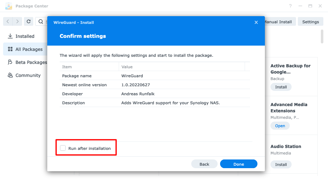 Chọn file WireGuard-apollolake-1.0.20220627.spk