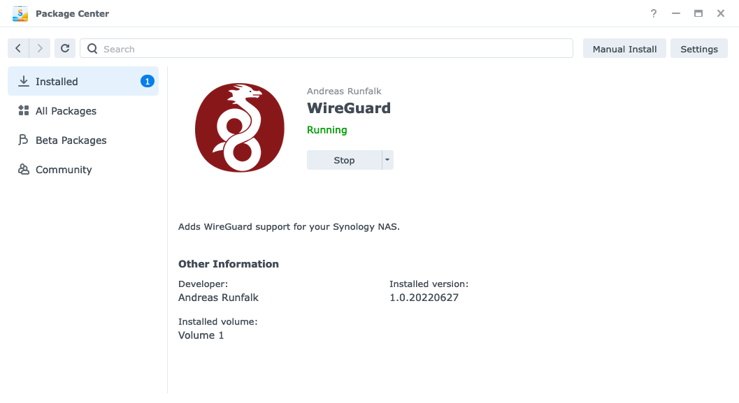 WireGuard has been successfully startedQuay lại DSM, mở Package Center, bạn sẽ thấy WireGuard đang hoạt động.