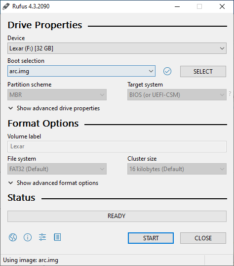 Cắm USB Flash Drive (dung lượng tối thiểu 4GB và nên dùng USB 3.0) vào máy tính, sau đó dùng Rufus để tạo Bootloader từ file arc.img.