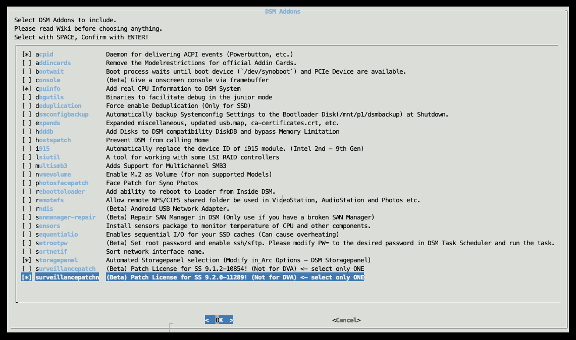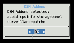 Ở bước chọn DSM Addons kế tiếp, một số addons đã được mặc định chọn sẵn. Chọn thêm surveillancepatchn nếu bạn muốn sử dụng 58 license camera cho Surveillance Station.
