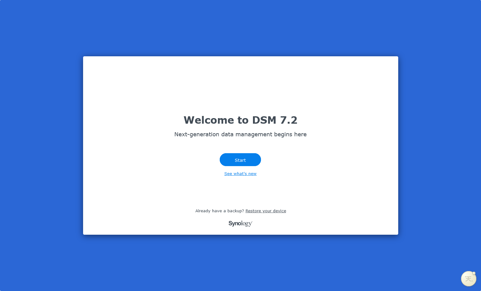 Các bước cài đặt DSM 7.2 thao tác y hệt như DSM 7.1. Sau khi cài đặt xong, bạn sẽ thấy màn hình chào đón Welcome to DSM 7.2 như dưới đây.