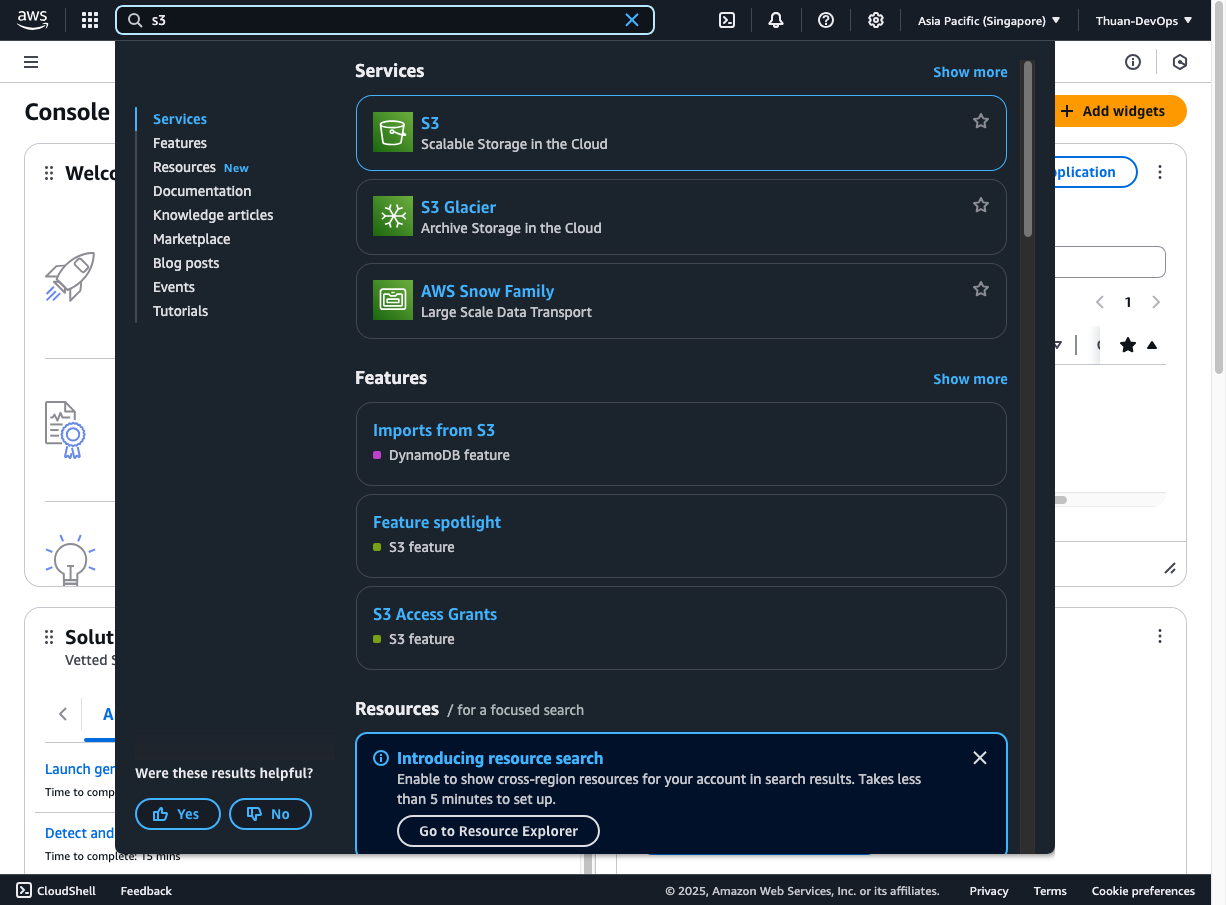 Đầu tiên, truy cập https://aws.amazon.com/ và đăng nhập bằng tài khoản AWS của bạn. Từ trang quản lý, tìm kiếm “S3” và chọn dịch vụ S3