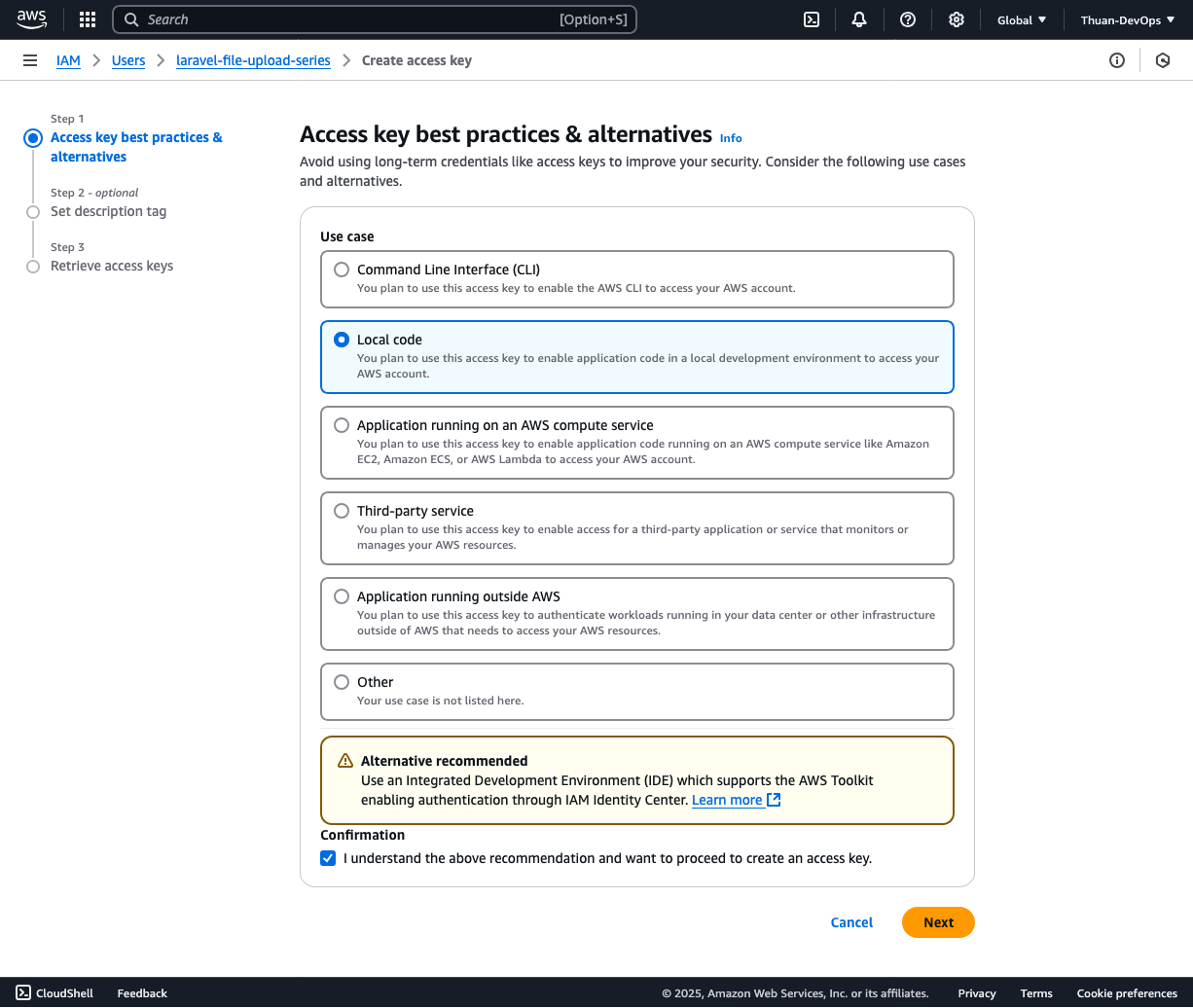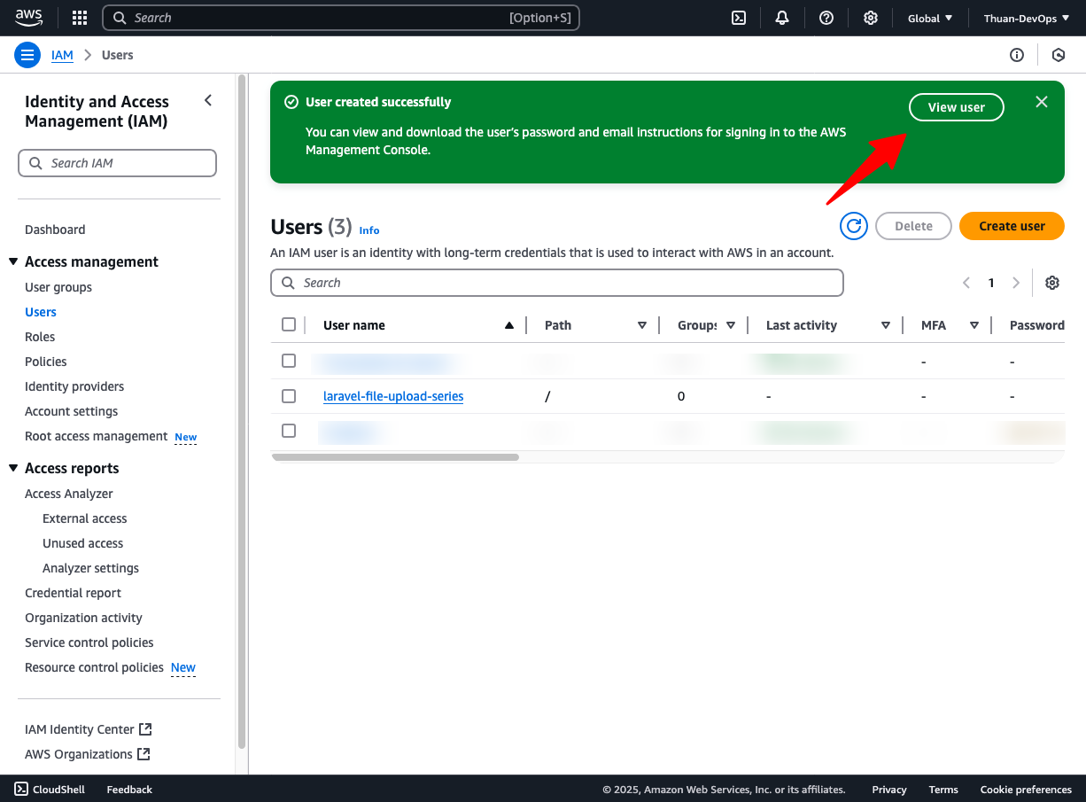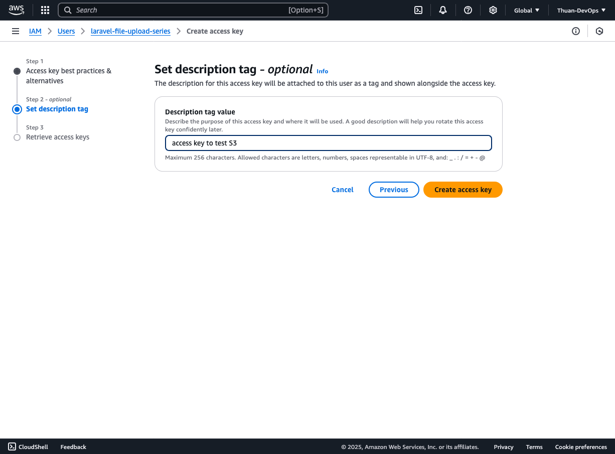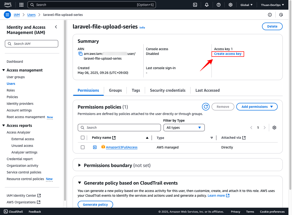 - Tạo Access Key và Secret Key để các ứng dụng (như Laravel) có thể kết nối đến Amazon S3 qua API