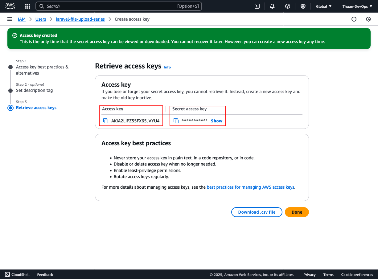 Access key cùng secret access key sẽ được hiển thị duy nhất một lần, bạn không thể xem lại sau khi thoát trang. Bạn cần lưu lại thông số này hoặc bấm vào nút Download .csv file để tải về. Bấm Done để hoàn thành.