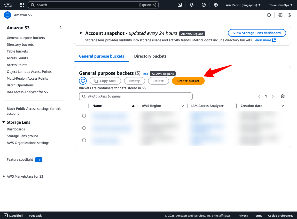 AWS Access Key ID [None]: A*****************4AWS Secret Access Key [None]: X**************************rDefault region name [None]: ap-southeast-1Default output format [None]:Xem danh sách S3 bucket