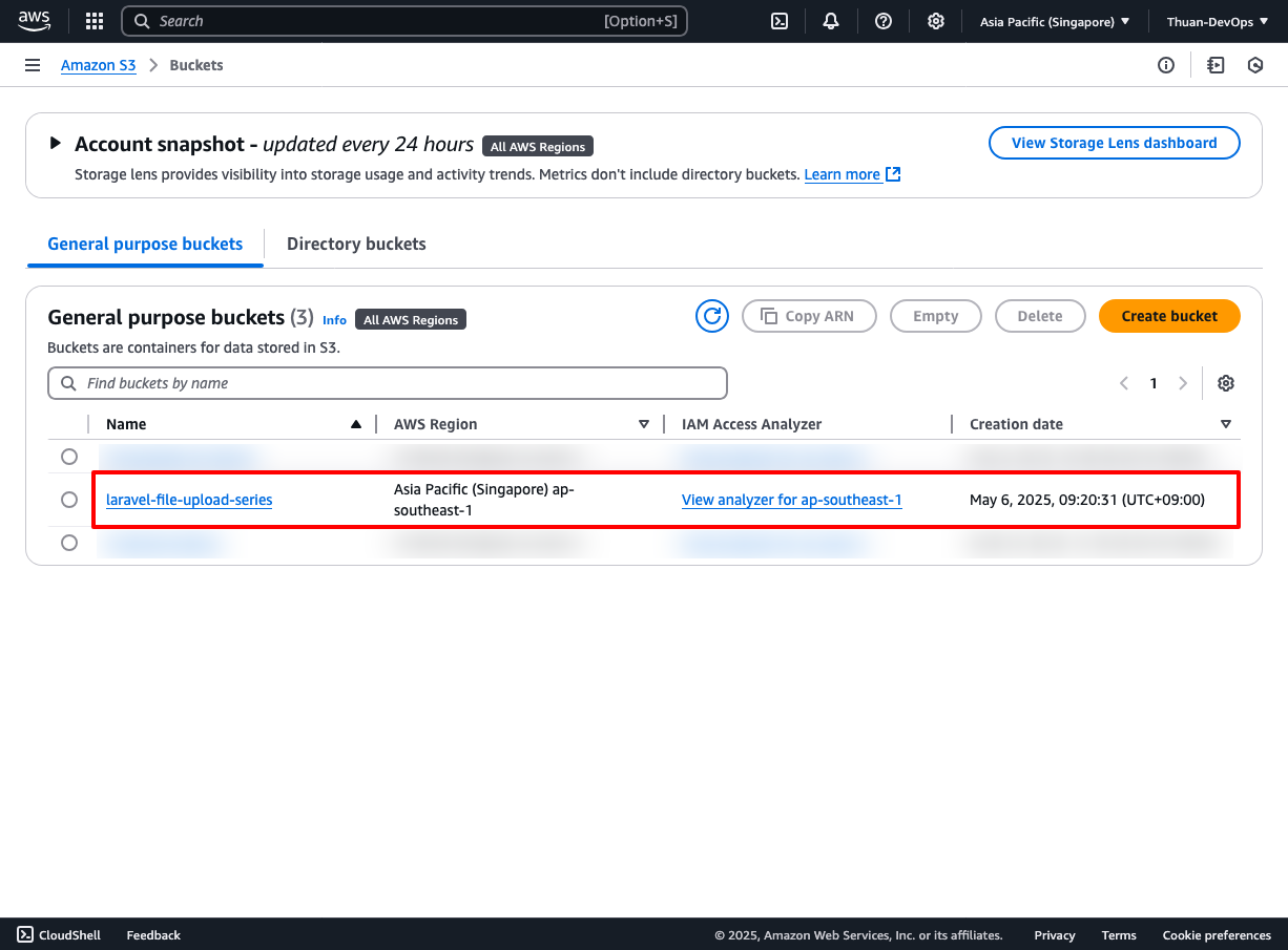 Bucket mới đã được tạo thành công. Bạn cần lưu lại thông tin bucket name laravel-file-upload-series và AWS Region ap-southeast-1 để khai báo trong các ứng dụng cần truy cập vào Amazon S3.