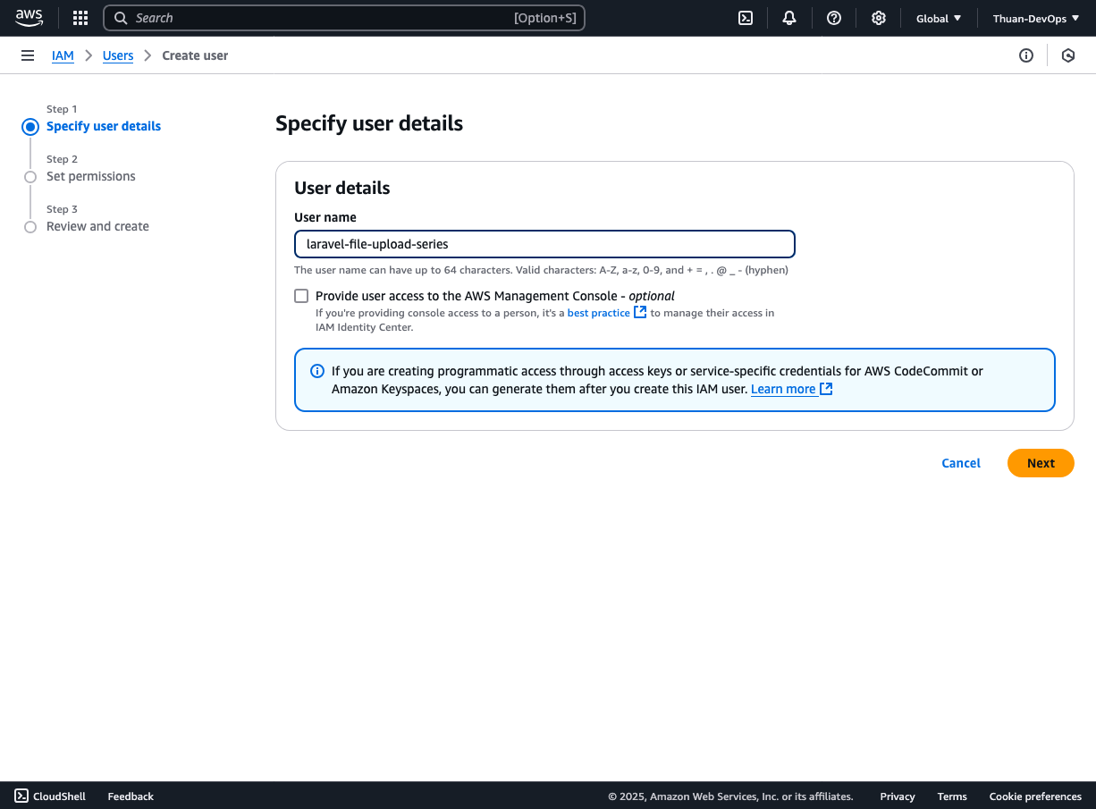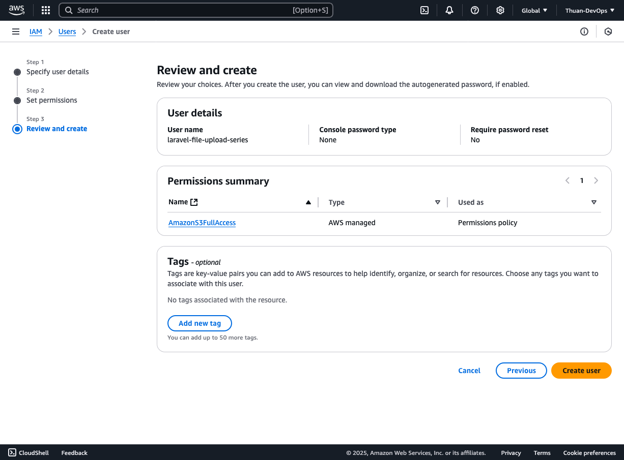 Đây là những bước thiết lập nền tảng, cực kỳ quan trọng trước khi bạn triển khai chức năng upload file lên Amazon S3 trong bất kỳ ứng dụng web hoặc mobile nào.