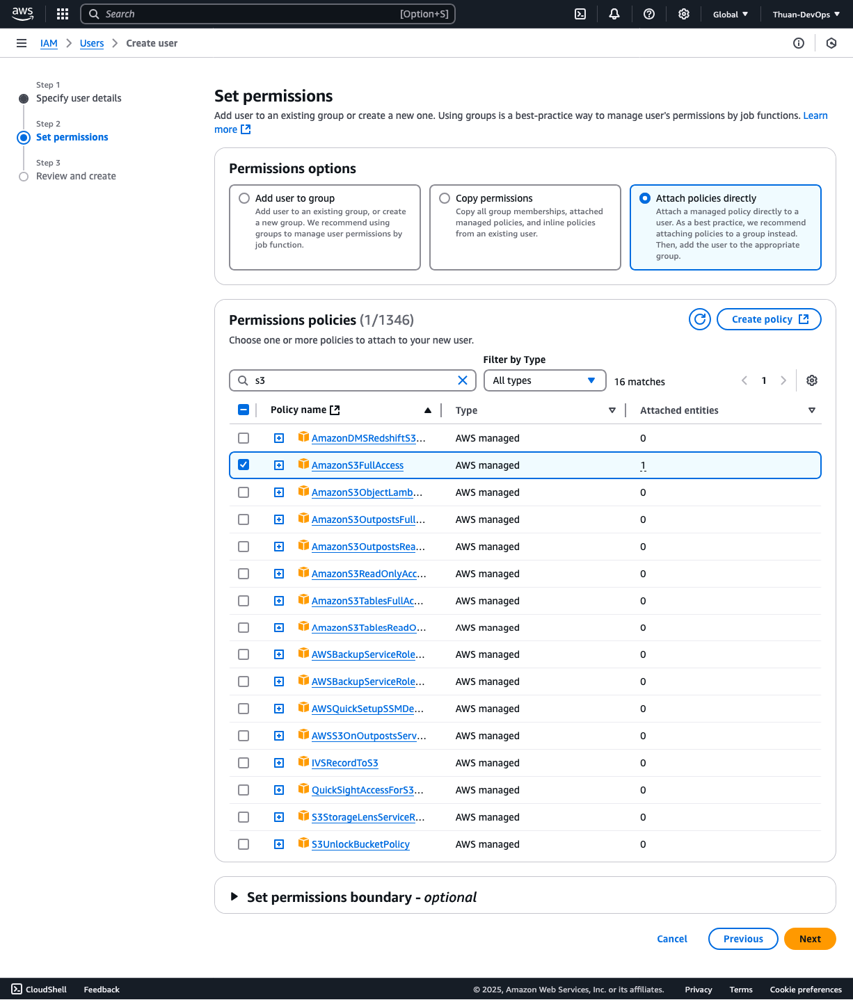 Chọn Attach policies directly, tìm S3 và tick chọn vào AmazonS3FullAccess (toàn quyền truy cập dịch vụ S3). Bấm Next