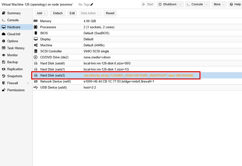 qm set 126 -sata3 /dev/disk/by-id/ata-TOSHIBA_MQ01ABF050M_X66BP0UWTupdate VM 126: -sata3 /dev/disk/by-id/ata-TOSHIBA_MQ01ABF050M_X66BP0UWT126: ID của máy ảo XPENology-sata3: kết nối vào máy ảo thông qua chuẩn SATA. Nếu cần passthrough nhiều ổ đĩa, cần phải đổi thành-sata4,-sata5,…/dev/disk/by-id/ata-TOSHIBA_MQ01ABF050M_X66BP0UWT: id của ổ cứng cần Passthrough
